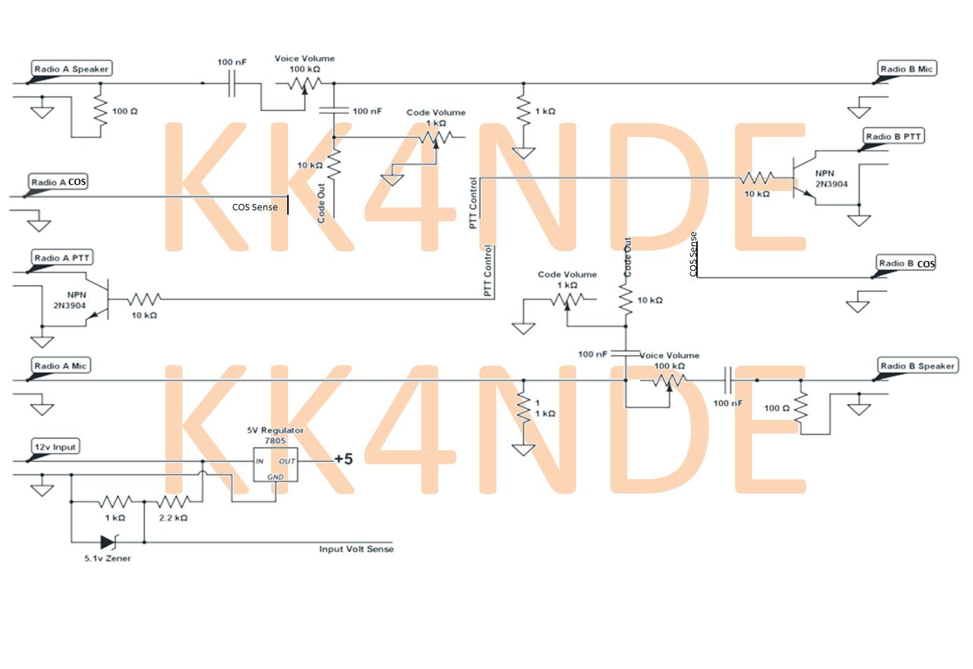 This is the schematic that would be used to connect the Arduino/ATTINY to the radios using COS instead of VOX. The left/right connections document where the radios are connected. The lines labeled "COS Sense", "Code Out", "PTT Control", and "Input Volt Sense" should be connected to the Arduino/ATTINY microcontroller I/O pins.