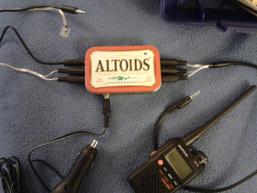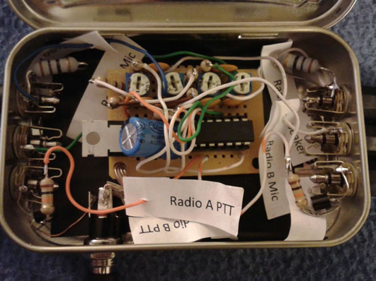 This is the completed repeater controller in an Altoids tin with adapter wiring for 2 radios I had at the time. By separating the Speaker, Microphone, and PTT into 3 connectors it provides lots of flexability for future radios and a trivial interface to connect things -- I could just as easily connect to a laptop soundcard or radio scanner as the "input".